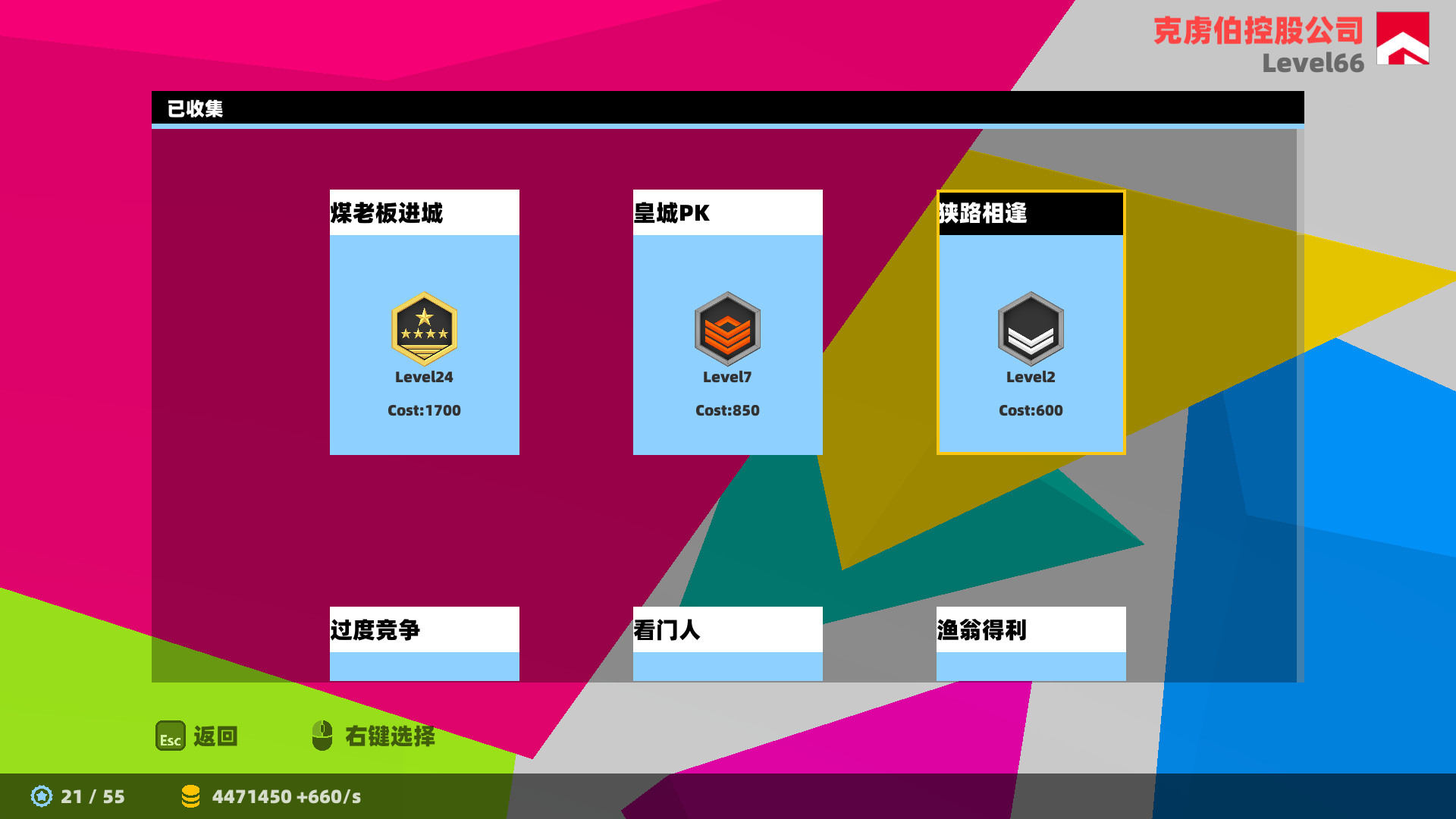 拥有50+各式各样的关卡,已过的关卡会被收集,可以重复游戏,并且提升该关卡的等级,为控股公司贡献更多利润